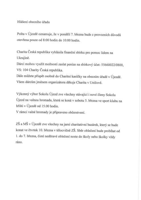 Úvod > Obec > Hlášení rozhlasu > Hlášení obecního úřadu dne 4.3.2022